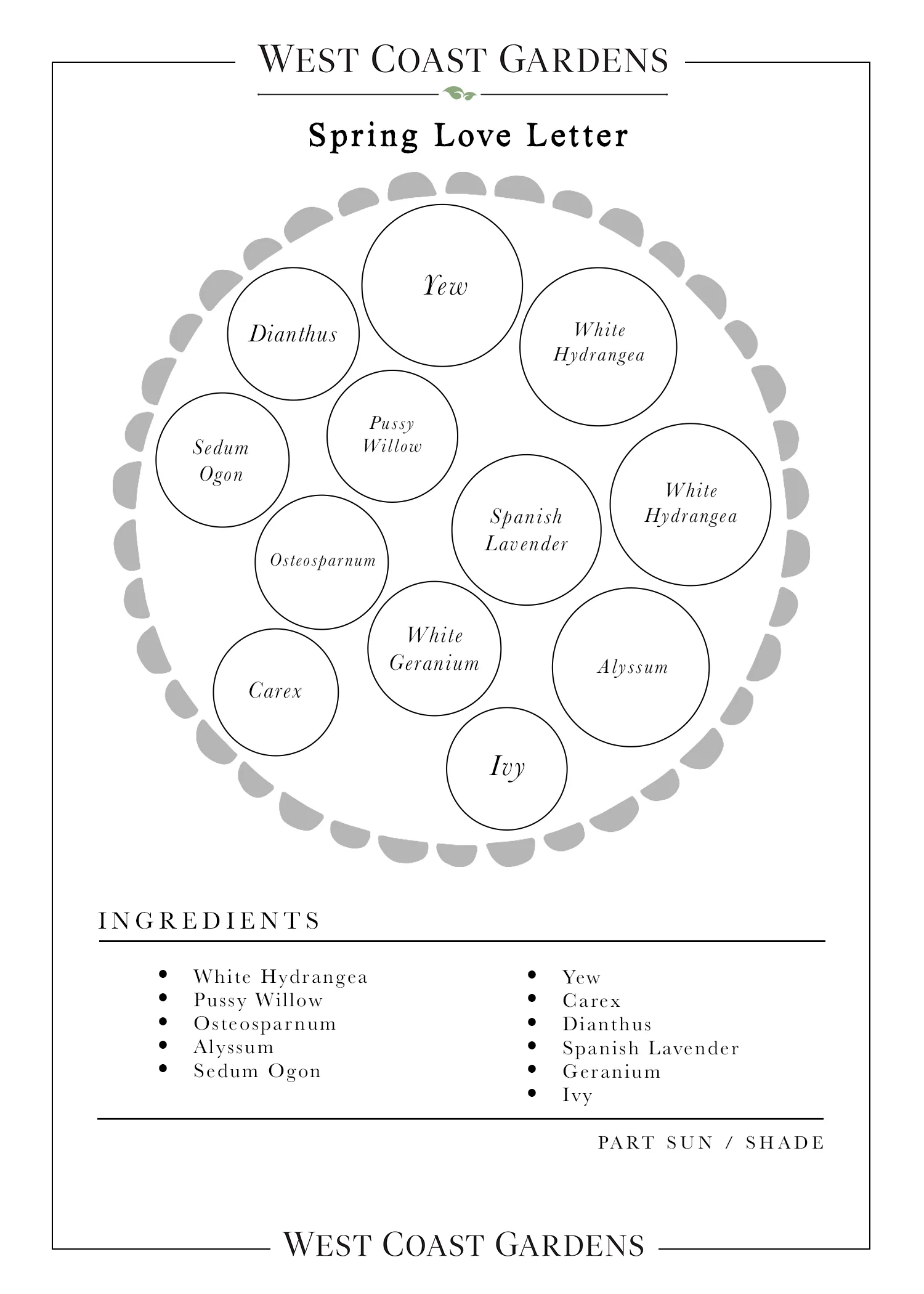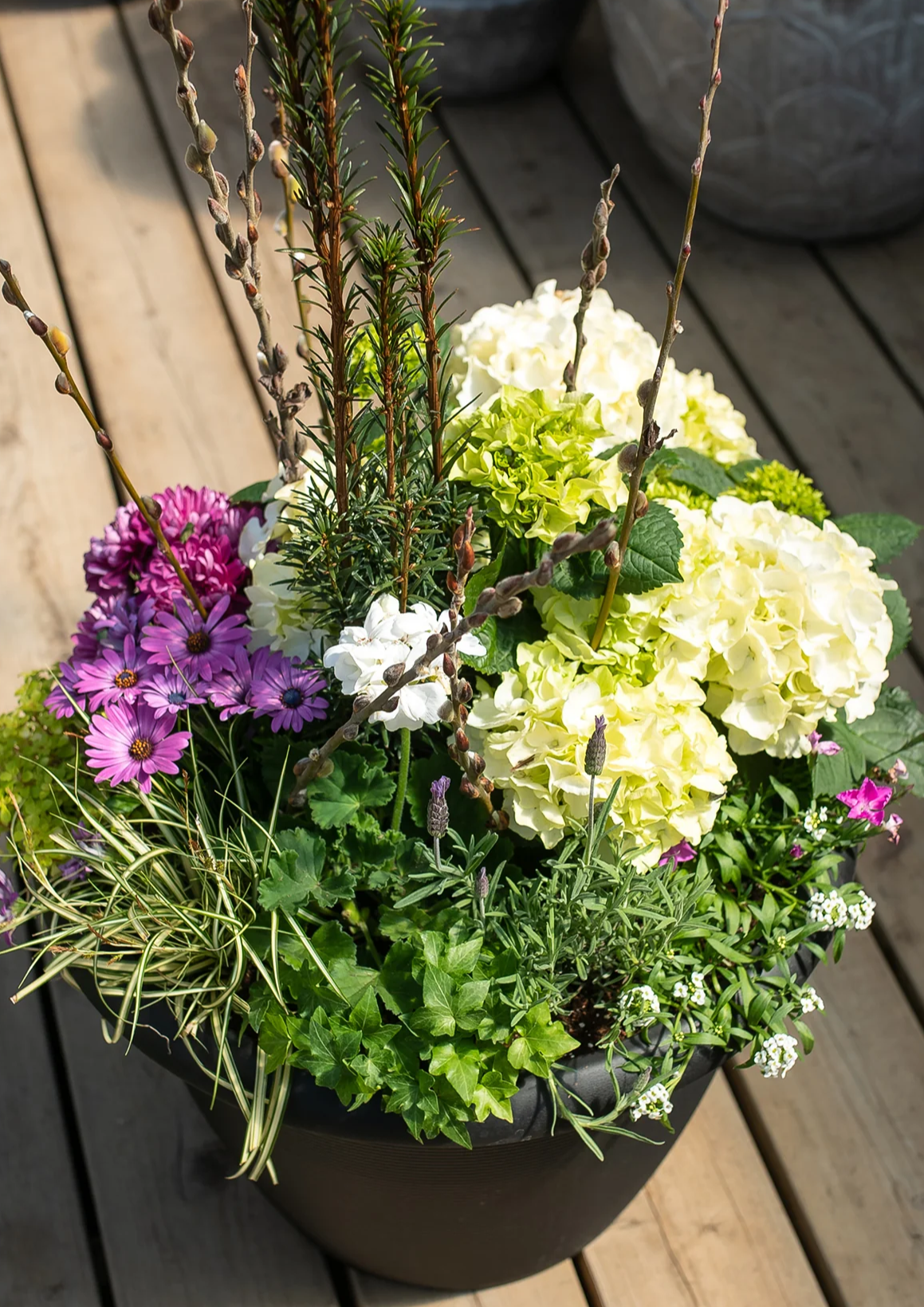 We've written a love letter to Spring with this planter! Giant white hydrangea blooms, mixed with natural branches of pussy willow and yew. Small white alyssum, ivy and carex add texture and interesting design elements. For a pop of colour we've used purple osteosparnum (African Daisy) and dianthus. (14"-16" pot)